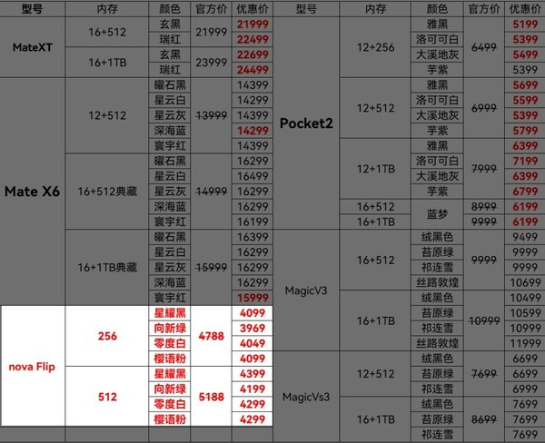 [CNMO科技消息]华为旗下的折叠屏手机产品线可以说是众多厂商中最丰富的,除了MateXT三折叠这种高端产品,也有定价亲民的novaFlip系列。据CNMO了解,近日有博主曝光了华为折叠屏手机的渠道价信息。从中可以看到,novaFlip的最低价已经来到4000元以下!
